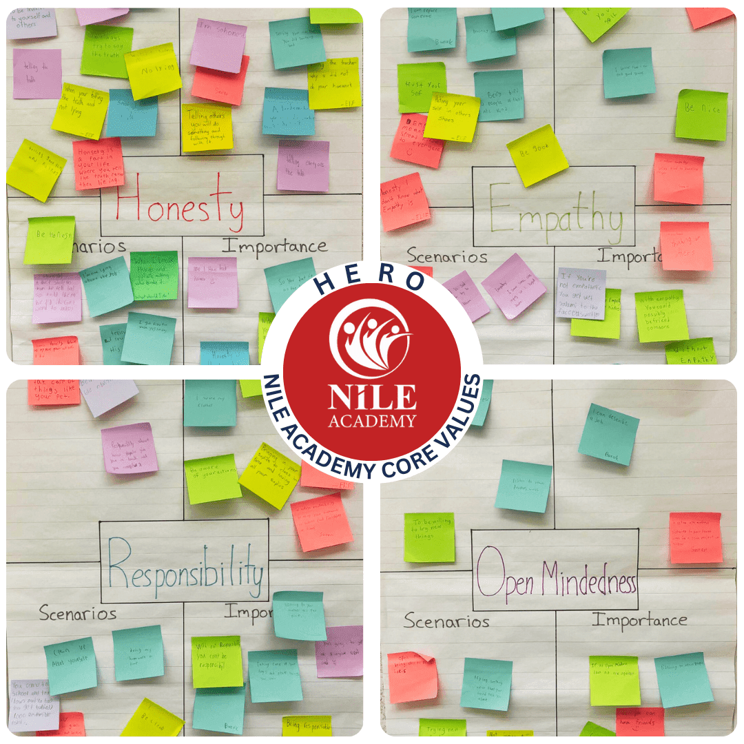 Nile Academy is aiming towards becoming a National School of character. Being a school of Character means we aim for our students to have good Character strengths or become good people. We develop different strategies and practices to help guide our students by using core values. Our school’s core values are Honesty. Empathy. Responsibility. Open Mindedness (HERO). Let’s Embrace our core values and Become a Nile HERO!